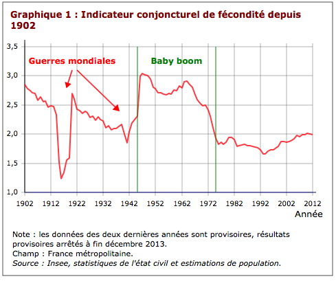 2 représente la fécondité française en métropole en nombre d’enfants par femme en 2012 selon l’INSEE.