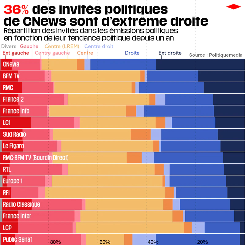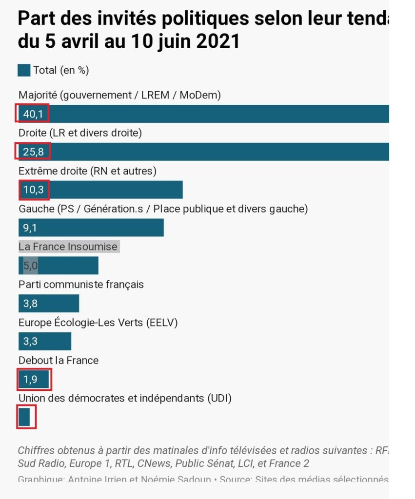 Ce qui me saute aux yeux, moi, ce sont les 14 médias, sur les 16 sélectionnés pour cette infographie, qui donnent plus de 50% de visibilité aux gauchistes de LREM, PS, FI, EELV, PCF,… avec une part disproportionnée pour les porte-paroles du gouvernement (on sait d’où viennent les financements de tous ces médias !). Et encore, je n’inclue pas (c’est très vilain de ne pas être inclusif !) la droite molle des LR et autres imposteurs qui sont des collabos de première (sinon les proportions des gauchistes dans les médias atteindraient des valeurs autrement plus honteuses et scandaleuses) !