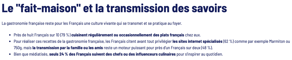 En tous les cas, cette dernière étude IPSOS qui vaut ce qu’elle vaut, permet de garder espoir quant à l’avenir de l’esprit français, de la sauvegarde d’un certain savoir-faire et d’une culture nationale typique. En effet, la gastronomie française ne semble pas dépérir et notre peuple (enfin, ce qu’il en reste) accorde une place des plus importantes au « fait-maison » traditionnel (79%), basé sur la transmission d’un héritage culinaire séculaire.