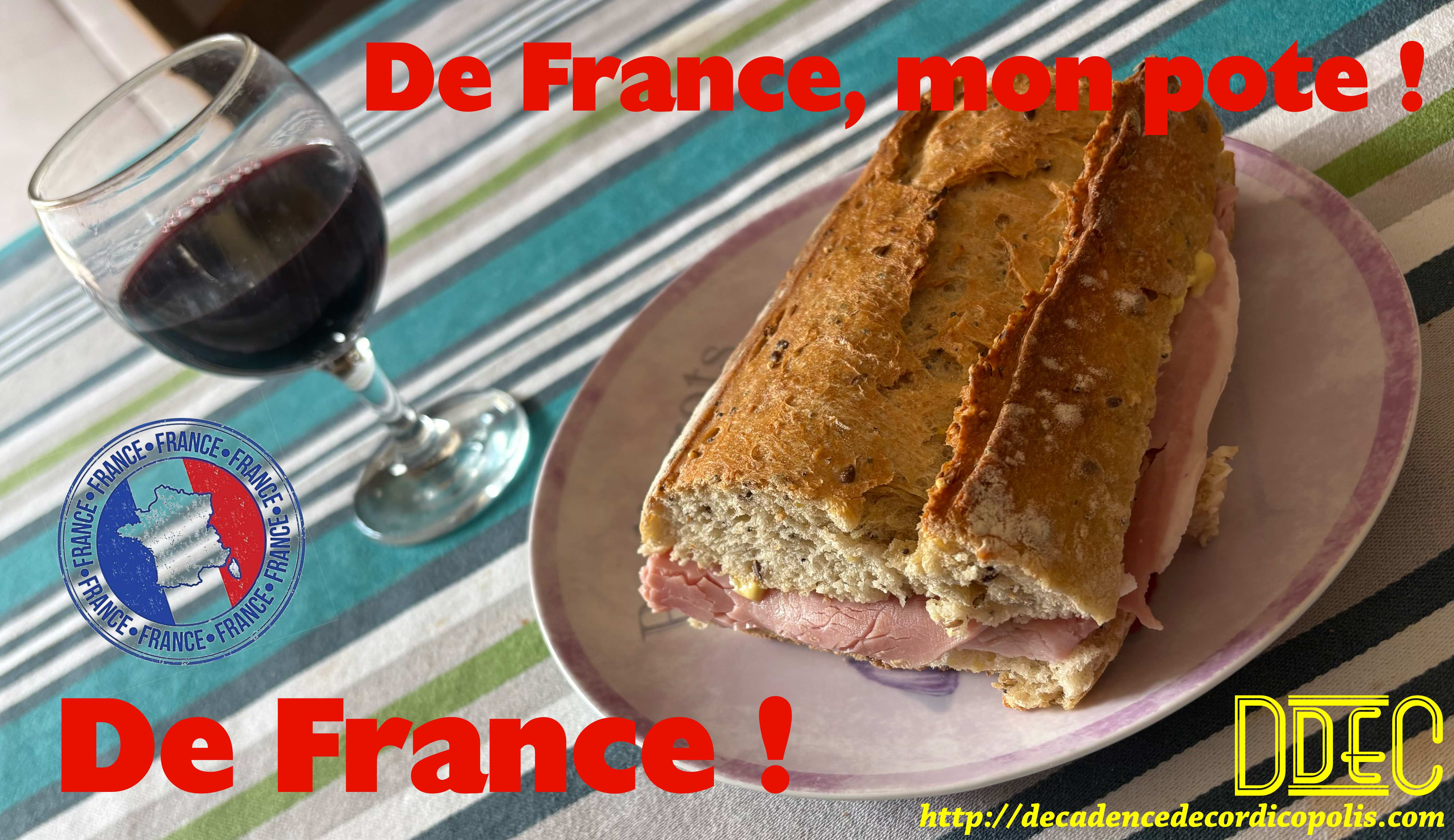 Petite faim oblige, je me suis fait tout à l’heure un bon sandwich avec deux tranches de jambon enserrant quelques cornichons savoureux, le tout encadrés par du pain chanacois beurré au demi-sel et agrémenté de moutarde… et, en posant sur la table le dit sandwich accompagné de l’incontournable ballon de rouge (cubi du Domaine Coste Moynier de Saint-Christol, 34400), je me suis posé un instant en me faisant la réflexion suivante : il suffit parfois de pas grand chose pour passer un excellent moment et qu’une journée de grisaille nous paraisse moins morose.