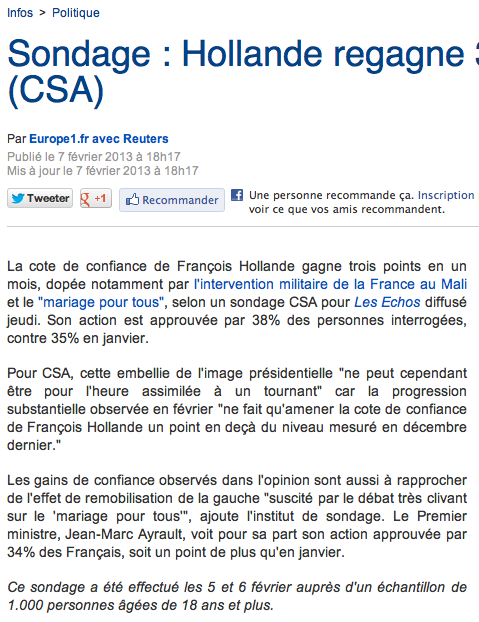 Mais tout de même, je trouve assez remarquable de la part des journalistes qui, en parlant de sondages seraient coupés des réalités (donc ayant un jugement a priori non fiable) pour 78% des français d’après Ipsos, qu’ils puissent rapporter (et donc appuyer) des appréciations plutôt délirantes des organismes tel le CSA qui n’hésite pas à parler d’une « embellie », terme ayant une connotation très positive et donnant une impression de grandeur (même s’il ne s’agit pas du réel sens de ce mot), alors qu’il n’y a que 3% d’augmentation (c’est-à-dire rien du tout !) et que l’intéressé reste à 38% d’opinions favorables ce qui ne représente en rien une quelconque légitimité pour donner des orientations à notre nation.