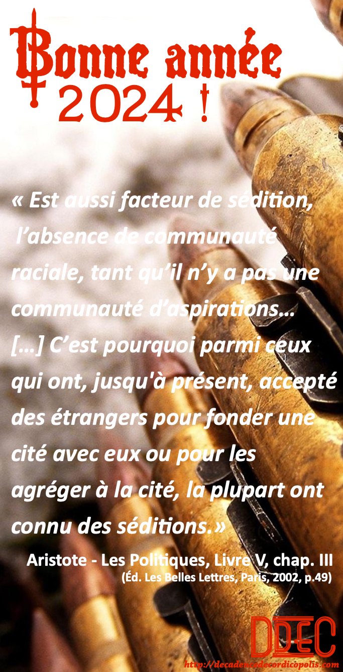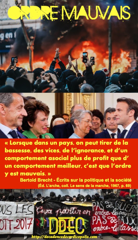 La liste est trop longue et nous sommes fatigués de toute cette parodie démocratique (utilisations abusives du 49.3 et des décrets réglementaires, ou passage d’une loi votée par des élus mais façonnée par la suite par des « sages » à la botte du présipède, cf. RTL du 26 janvier 2024), de toute cette société du spectacle !