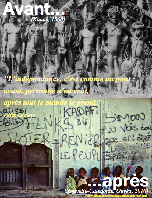 Depuis longtemps, le sort des DOM-TOM m’a toujours interpelé. Déjà, lors des évènements de la prise d’otages d’Ouvéa en 1988 par les indépendantistes kanak du FLNKS, je m’interrogeais sur notre légitimité à posséder une terre d’Océanie à plus de 17 000 km de chez nous alors qu’en juillet 1962, nous avions cédé à juste titre l’Algérie à son destin autonome. Comment peut-on considérer comme français ou occidental un peuple bien plus proche des Papous de Nouvelle-Guinée (chasseurs-cueilleurs, étuis péniens,…) que de notre peuple européen ?
