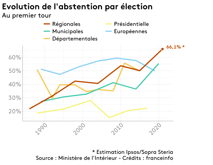 Ce qui me fait le plus hurler de rire et l’explication fumeuse du « Barbier de Paris » à propos de l’abstention record lors de ces élections régionales et départementales post-Covid ! Avec 66,1%, comment oser prétendre que les Français ne s’intéressent qu’aux présidentielles juste parce que les pourcentages d’abstention sont les plus faibles ??!!! Est-il si saugrenu d’envisager un instant que les français en ont ras-le-bol des politicards qui se présentent régulièrement, qu’ils en ont assez des discours positifs et plein de promesses alors que leur quotidien est loin d’être aussi rose que celui des apparatchiks de partis ? Les Français ne tournent pas le dos au vote, à la démocratie mais signifient depuis des années (les valeurs du graphique ci-contre ne font que confirmer un phénomène ancien) qu’ils ne veulent plus de ceux qui se représentent systématiquement, qu’ils rejettent la grande majorité des bouffons qui donnent un piètre spectacle de la démocratie à l’Assemblée Nationale ! Mais bon sang !… Quand est-ce que tous ces peintres en république et ces chroniqueurs à deux sous vont se remettre en cause, vont intégrer que ce sont eux qui sont à l’origine de cette bérézina démocratique ?!!!… Sérieusement, comment peut-on être aussi aveugle à moins de le faire exprès ? Et évidemment, c’est bien le cas ! Ils le font exprès, les politicards et leurs fidèles toutous du monde médiatique s’offusquent de cet état de fait mais au fond, ils en sont bien contents puisque cela leur permet de rester en place et de profiter du système tant qu’ils le peuvent !